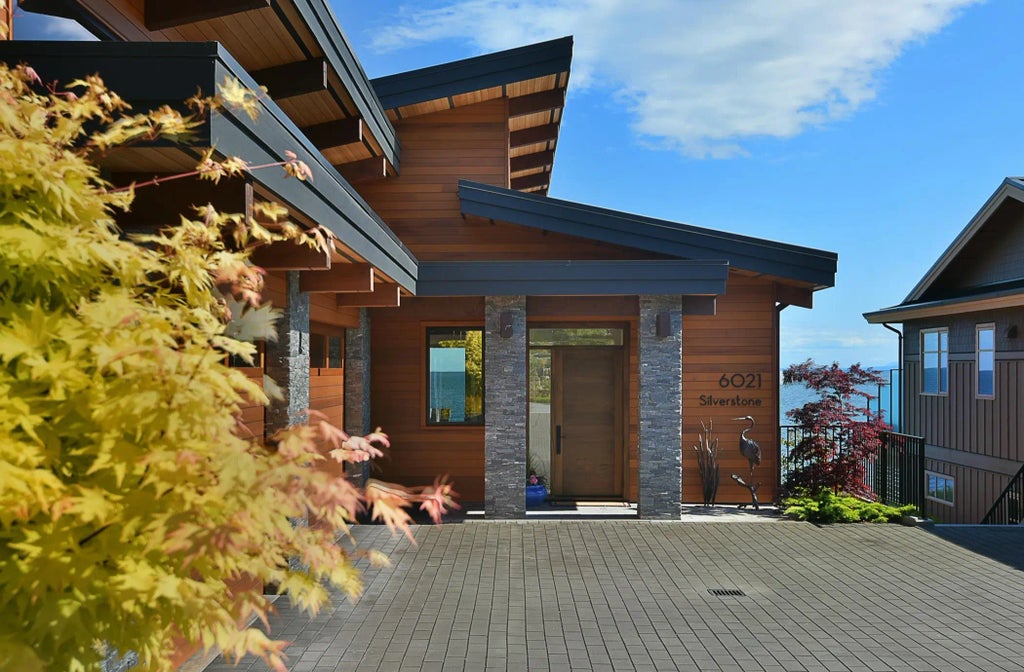 6021 Silver Stone Lane, architecturally designed and constructed by Dave Hutt fine homes. This stunning contemporary home exudes style, design, and attention to detail. Floor to ceiling windows and doors capture abundant natural light and enhance unparalleled views of Trail Bay and all 4 of the the Trail Islands. The primary bedroom with its beautiful windows place the view center stage, the primary bathroom is truly lovely. The kitchen living and dining room are open and expansive with high vaulted clear cedar ceilings with tasteful fir beams. Take the stairs or elevator to the lower floor, 2 large bedrooms with ensuite bathrooms and family room, Oceanside gardens & entertainment area with built in hot tub and one-of-a-kind gas fire pit easy access to the pebble beach for beach activities