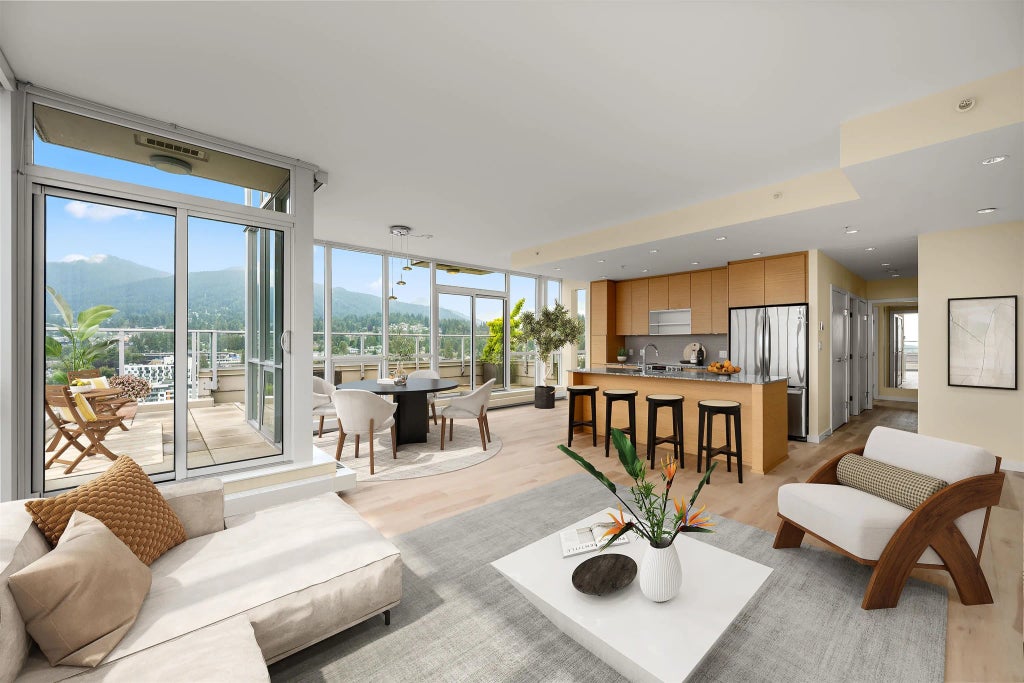 NW CORNER PENTHOUSE - Spectacular unit on the best corner in the building! Amazing Ocean, North shore mountains & city skyline views throughout. Welcome to this rare 1,284 sqft 3 bed and 2.5 bath w/290 sqft wrap around balcony. This bright & airy residence offers floor-to-ceiling windows and thoughtfully laid-out bedrooms to provide privacy between rooms (two w/ensuites). Open concept layout features a modern kitchen w/large granite island, ideal for cooking & entertaining. Meticulously maintained & in pristine condition. 2 side-by-side parking stalls & 1 locker. Amenities: Rooftop skygarden, lounge, well-equipped gym, guest suite, workshop, visitor parking & dog wash. Direct access to City Market from parkade. Desirable Central Lonsdale location- restaurants, cafes, groceries + transit.