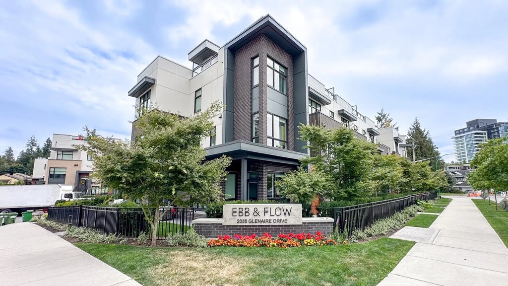 Welcome to Ebb & Flow! This beautifully designed 3-bedroom, 2.5-bathroom townhome offers spacious two-level living and a large rooftop patio perfect for entertaining. Quietly located in a desirable corner of the complex, with a playground just steps away and a recreation center nearby, it's ideal for families. The modern kitchen features premium Bosch appliances, a waterfall-edge island, and quartz backsplash. Other highlights include laminate flooring, two parking stalls, and a storage locker nearby. Close to shopping, Grouse Mountain, Highway 1, and downtown Vancouver—this home blends comfort, style, and convenience.