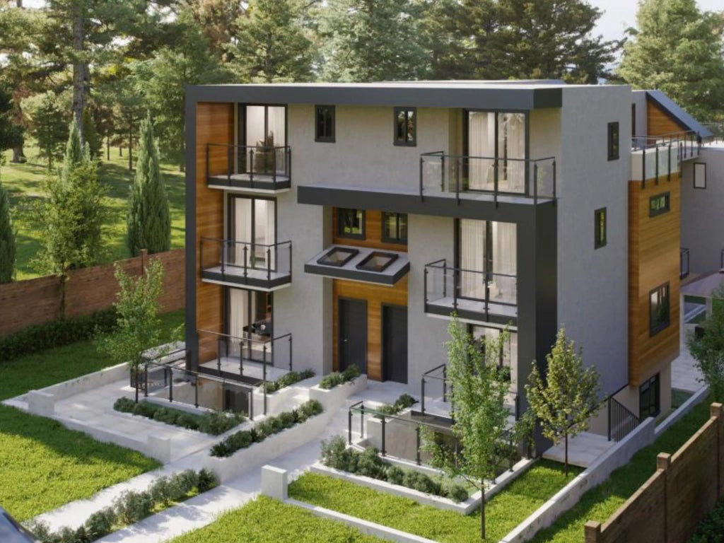 BUILDERS, DEVELOPERS & INVESTORS – PRIME Central Lonsdale opportunity! Includes plans for 5 townhomes w/ lock-off suites (8,670 sq ft total, units 1,675–1,810). Solid side-by-side duplex w/ 4 suites: two 3-bdrms w/ ensuites + 400 sf sundecks w/ mountain views, plus two 2-bdrm garden suites w/ yard access. Large flat 49.8x139.9 lot w/ lane, RT-1 zoning, OCP up to 1 FSR. Current rent ~$6K/mo. Rare offering—hold, rent, live in one side, or build new!