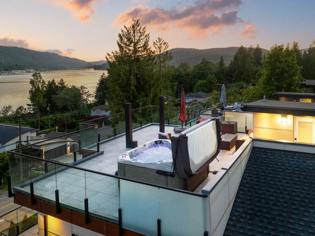 This exceptional south-facing residence has been extensively upgraded with premium finishes and sophisticated design, elevating it well beyond the original build. Ideally located on prestigious IOCO Road, it showcases unobstructed views of Burrard Inlet from every level, perfectly framed by sunsets and coastal scenery. A heated driveway leads to your private double garage for year-round comfort. Entertain on the expansive rooftop deck featuring an 8-person jetted spa with panoramic water views. Inside, the chef-inspired kitchen boasts MIELE appliances, while a modern two-way fireplace creates separation & ambiance between the living and dining areas. A well-appointed two-bedroom legal suite & separate guest suite on the lower level offer both flexibility & rental income. Open House Sat 3-5