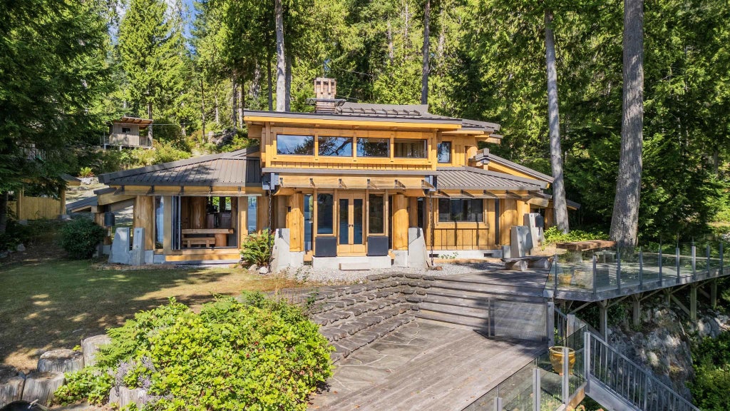 A rare opportunity to own an architectural WATERFRONT masterpiece. Designed by renowned architect Henry Yorke Mann, Posts Standing is a striking West Coast Modernist retreat that blends bold design with the natural beauty of West Bay on Gambier Island. The 2-bed home was milled with logs from the beautiful 1.2-acre, SE-facing acreage and features expansive glass windows to create a feeling like it was grown from the land itself. The estate features a guesthouse with 3 pce bath, a 2-stall carport, a large play area for kids, a sauna, and a large garage/workshop with tons of storage. This estate comes with all of the toys, John Deere 4-seat Gator, Peloton, water bike, 2014 Sea Doo with a ramp and winch on a permitted 20'x35' dock with a Funicular elevator & custom stone steps. Must see!