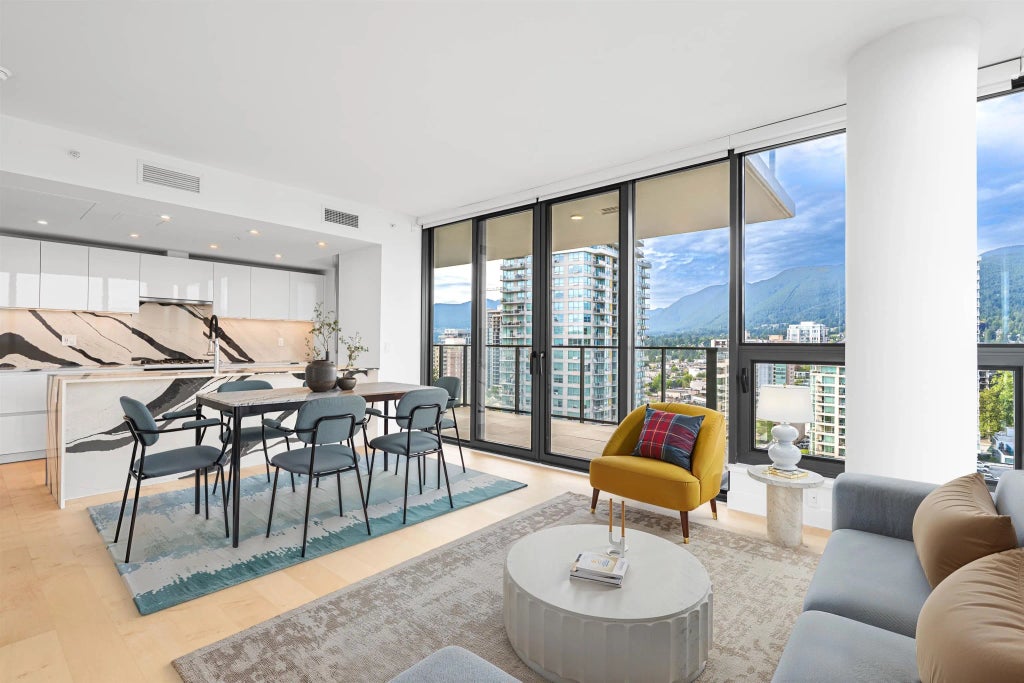 GREAT VALUE! GST ALREADY PAID! Welcome to Millennium Central Lonsdale, North Vancouver’s premier luxury residence with resort-style amenities. This spacious 990 Sqf. sunny corner unit offers 2 bedrooms, 2 bathrooms, and 220 sq.ft. of balconies with stunning 180° mountain and water views. Enjoy high-end finishes, a walk-in closet in the master, and spa-inspired bathrooms. The gourmet kitchen features Miele appliances, marble-inspired quartz countertops, European cabinetry, and in-cabinet lighting. Stay comfortable with air conditioning and automated roller blinds. EV-ready parking included. Steps from shopping and dining, this home perfectly blends style, comfort, and lifestyle.Don’t miss out, This opportunity won’t last long!