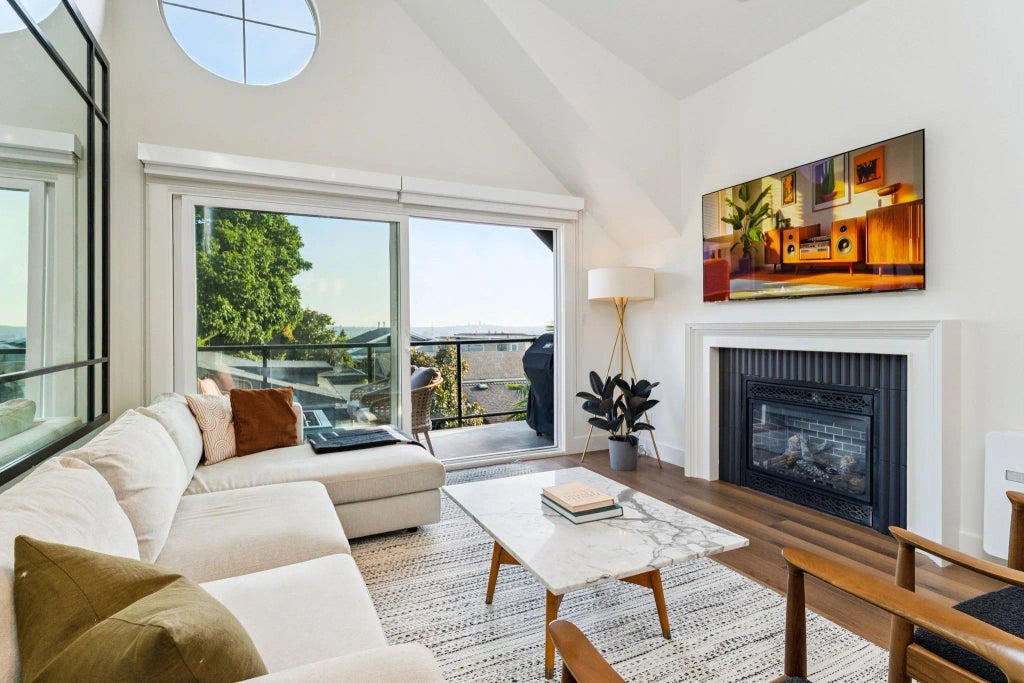 Beautifully updated 3-bed, 3.5-bath half duplex located at 8th & St. Andrew’s, one of Central Lonsdale’s most desirable streets. The top level showcases a bright living, dining,& kitchen area with soaring 14-ft ceilings, skylights, downtown views, gas fireplace, and powder rm. The entry level offers 2 bedrms, including a primary retreat with spa-like ensuite and gas fireplace. The lower level offers a third bedroom with ensuite, perfect for guests, teens, or a private office. Features include radiant infloor heating, a sunny south-facing backyard, lane-access garage plus carport, and a large crawl space with abundant storage. Recent updates include new flooring, bathrooms, upgraded kitchen, & fresh exterior and interior paint. This home is truly move-in ready! Open House Sat Oct 4th 2-4 PM