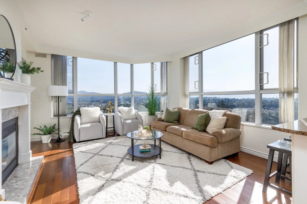Experience luxury resort-style living at Regency Park Towers! This bright, airy home boasts 9' ceilings, huge primary bedroom with his & hers closets & ensuite. Relax by the cozy gas fireplace (unique to some upper floor units) with massive windows framing stunning views of Mt. Baker, the Fraser Valley & Coastal Mtns. The kitchen features expansive windows, abundant cabinets & breakfast bar. Enjoy sunrises w your morning coffee on the enclosed balcony. Updates include new carpets, paint, hardware & lighting. Well-run strata with large contingency reserve, 2 side-by-side parking, possible RV parking, indoor pool, hot tub/sauna, gym & guest suites. No age restrictions, 2 indoor cats allowed. Conveniently located- steps to Superstore, Mill Lake, Seven Oaks, restaurants, churches & transit. Mo