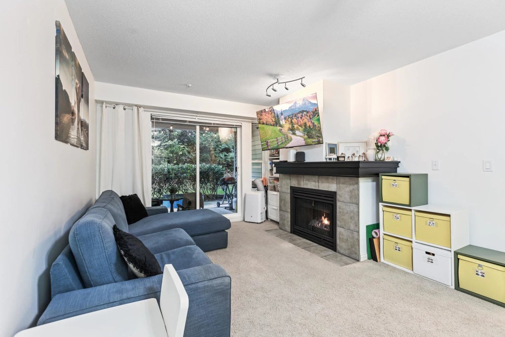 Bright & spacious 1 bedroom + den ground level unit. With a southeast exposure, this unit is thoughtfully designed with no wasted space. Kitchen offers ample cabinet space, with breakfast bar - flowing into the living & dining area, making the home feel airy & functional. Enjoy a cozy gas fireplace and a large private patio - perfect for morning coffee or entertaining while surrounded by lush greenery. Large bedroom fit for a king size bed features a walk-in closet, while the den offers flexible space for a home office or enclose it for a private guest room when company stays. Located in the heart of Port Moody Centre, you'll love being within walking distance to the West Coast Express, SkyTrain, Rocky Point Park, Brewers Row & Schools.1 large parking & storage locker. Quick Possession