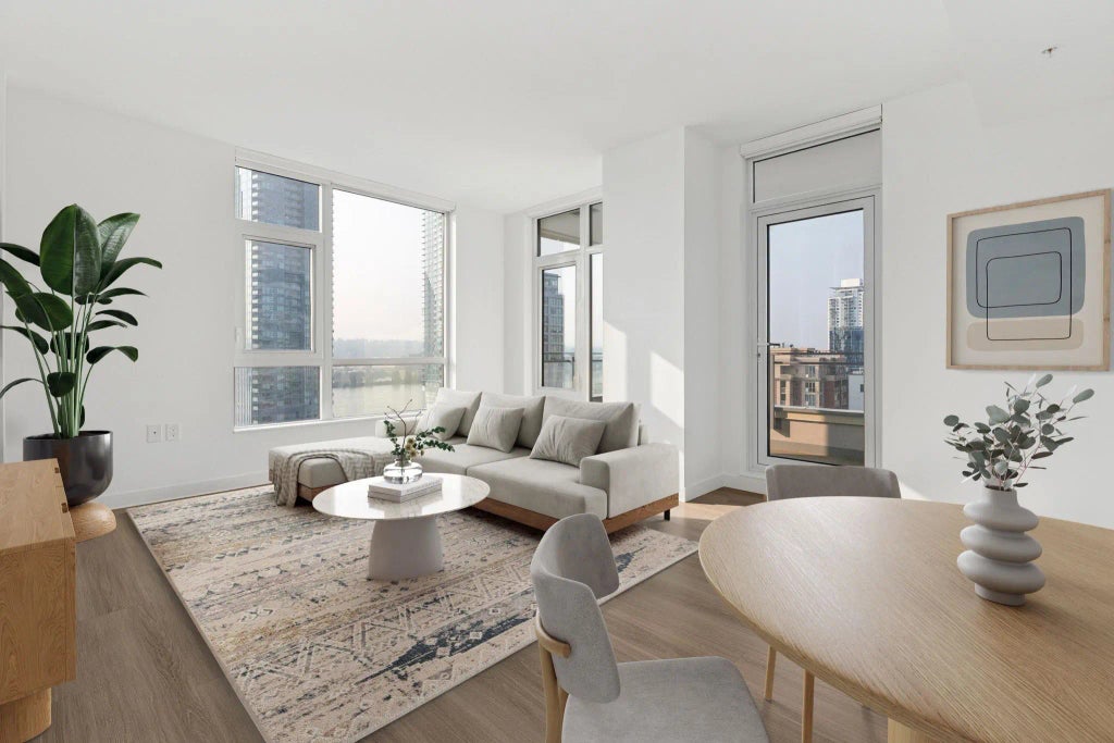 Welcome home to 618 Carnarvon! This 889 SF, 2 Bed, 2 Full bath, CORNER SUITE features the rarely available C2 plan, south exposures, UNOBSTRUCTED RIVER VIEWS, quartz countertops, porcelain backsplashes, under cabinet lighting, FORCED AIR HEATING & COOLING, 5 burner gas range, BOSCH appliances, KOHLER fixtures, wall to wall tiles in both bathrooms, 1 locker, & 1 Parking with EV ROUGH-IN. Both bedrooms are on opposite sides of the home for extra privacy. Square living/dining area makes it easy for furniture. Enjoy water views & BBQ's from your large balcony. Amenities include 30,000 SF of garden areas, party room, workspace/meeting room, firepit/BBQ area, gym, & guest suite. Only 5 mins walk to TWO SkyTrain Stations, restaurants, Pier Park, cafes, & grocery. OPEN HOUSE: Sat, from 12-1:30pm.