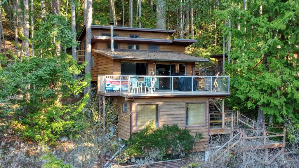 Rare waterfront cottage in Secret Cove is a great opportunity for those who are looking for affordable, private moorage. The 3 bedroom cabin has been very well maintained and features beautiful views over Secret Cove with south-west exposure and stunning sunsets off the deck. The recent installation of new floors , fresh paint, and improvements to the stairs make it turn-key ready for the summer season. The entire property offers nearly 3 acres of oceanfront with protected moorage at the community dock, providing immediate access to boating and fishing year-round. The south-facing deck is perfect for relaxing or entertaining. Join this exclusive group of cabin owners in a prime location.