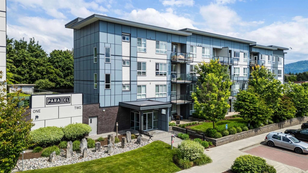 Welcome to this Immaculate 1 Bed 1 Bath unit in sought after Parallel Two in East Abbotsford! This condo is beautifully layout with stainless steel appliances, ample cupboard and counter space in kitchen looking onto spacious living room with huge window for natural light. In suite laundry and 4 piece bathroom. Large primary bedroom with walk-in closet. Enjoy a coffee on your private deck looking out to the quiet treed landscape. Includes 1 underground Parking Stall. This well run building has a quiet courtyard to enjoy and is a short walk to everything you need, from grocery stores, coffee shops, dining, gym, parks, quick HWY 1 access, and close to all levels of schools.
