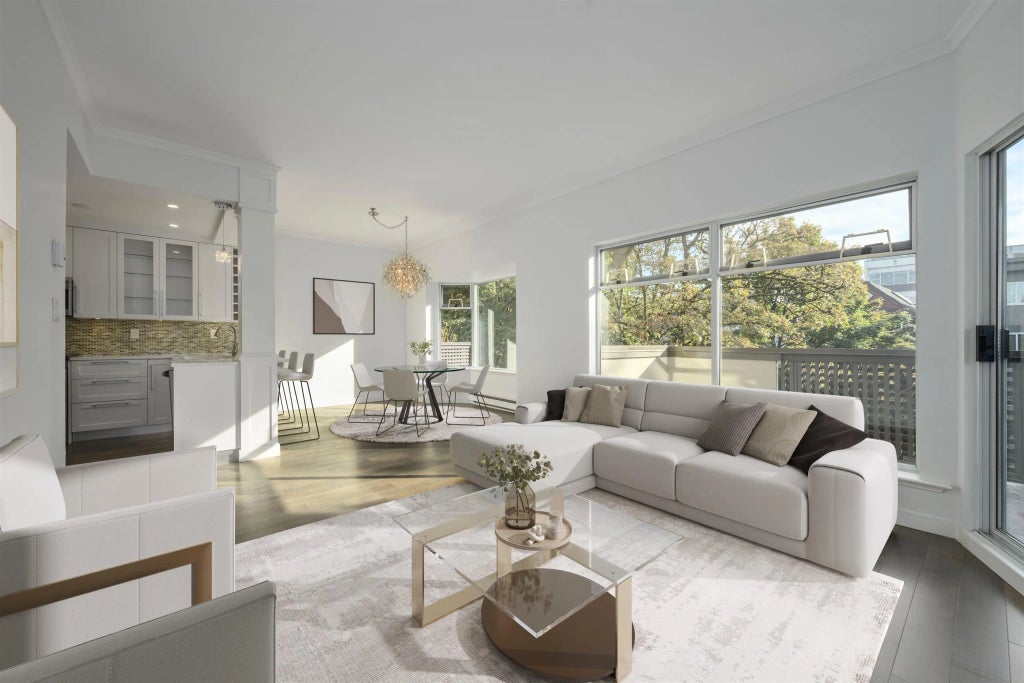 NORTH OF 4TH – Stunning TOP FLOOR CORNER 2 Bedroom home nestled on a quiet, tree-lined street. Fully renovated with an open kitchen featuring quartz counters & stainless steel appliances. Bright & airy with 9' ceilings, hardwood floors, spacious living/dining areas & cozy gas fireplace. Bright SW exposure fills the home with natural light and extends to a large wraparound deck showcasing peek-a-boo mountain views. King-sized primary suite with spa-inspired ensuite incl. rain shower, soaker tub & heated floors. Large 2nd bedroom offers ample comfort plus custom built-ins in all closets for extra storage. Includes 1 parking, 1 locker & in-suite laundry. Pet-friendly building in unbeatable Kitsilano location—steps to W 4th shops, cafes & a short stroll to the beach! Offers Oct 28 at 5:30pm.